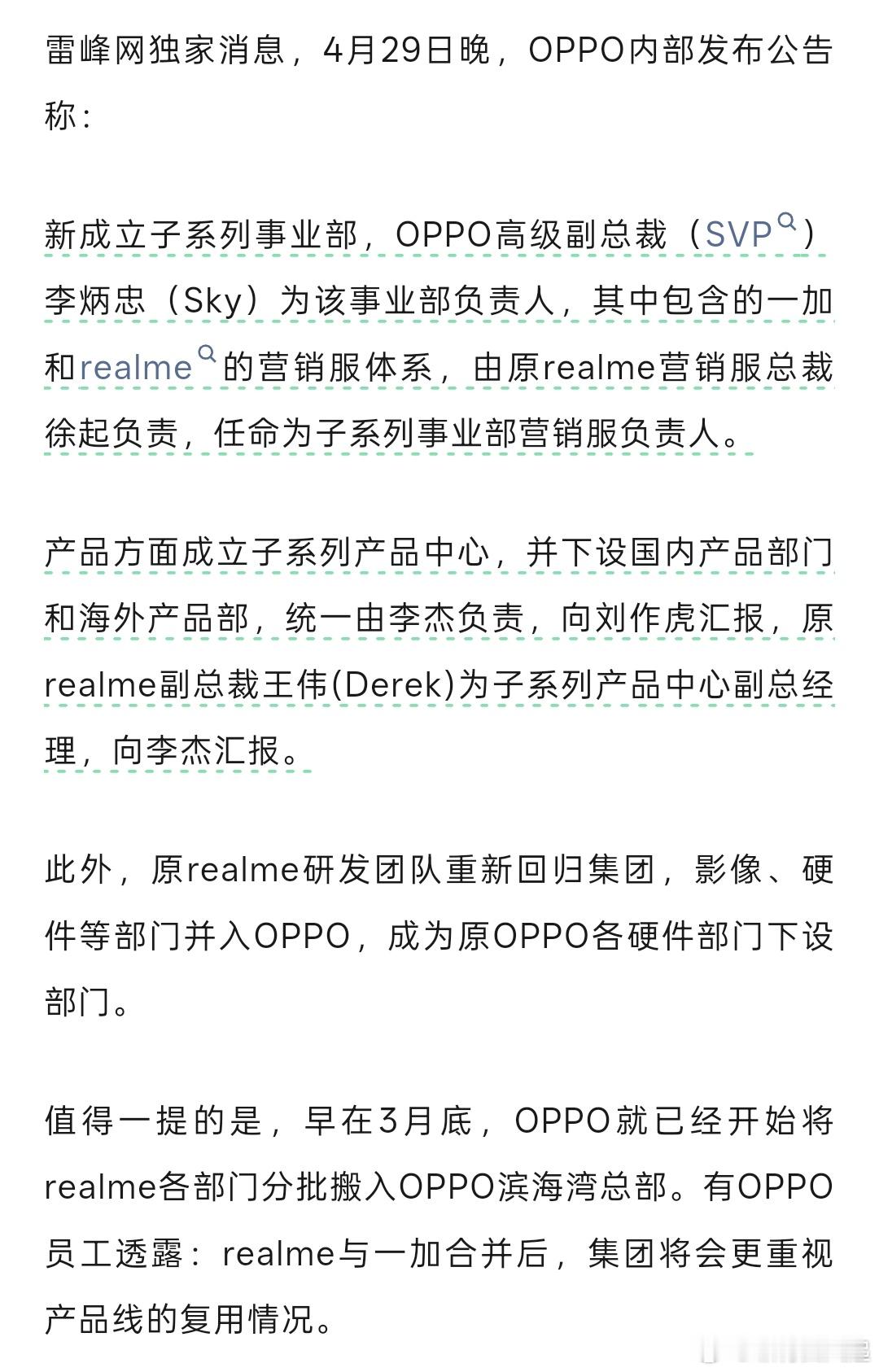 realme并入OPPO后,和一加共同成立子系列事业部,李炳忠任总经理,李杰同时