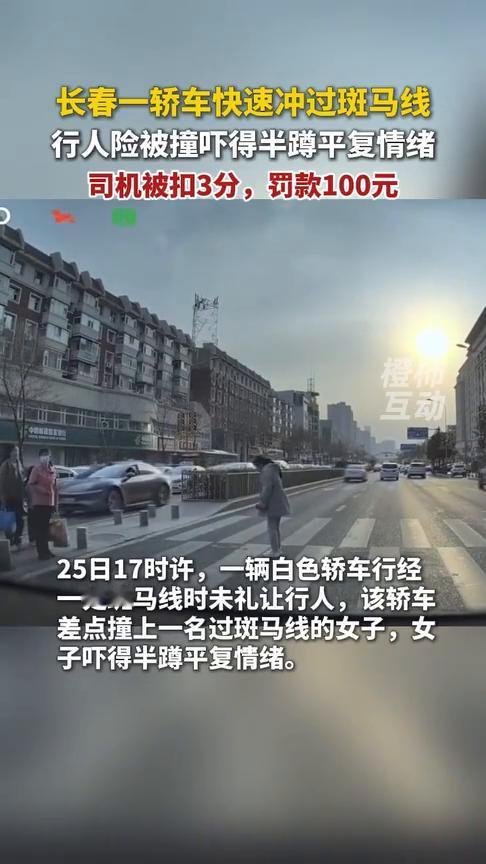 长春一轿车快速冲过斑马线,行人险被撞吓得半蹲平复情绪,司机被扣3分,罚款100元。