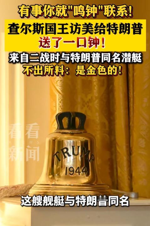 英国国王访美竟给特朗普送了一口“钟”!4月28日,特朗普设国宴款待英国国王查尔斯三世一行,期间,查尔斯向特朗普赠送了一口钟,上面还刻有特朗普的名字,查尔斯甚至贴心的说:“如果哪天需要联系我们,尽管鸣钟!”