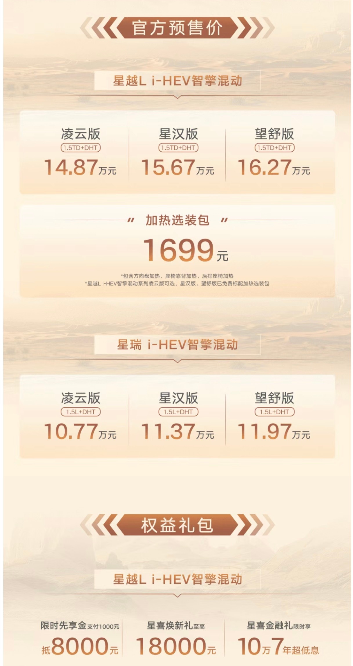 星瑞i-HEV预售价9.67万-10.87万星越L i-HEV预售价13.07万-14.47万