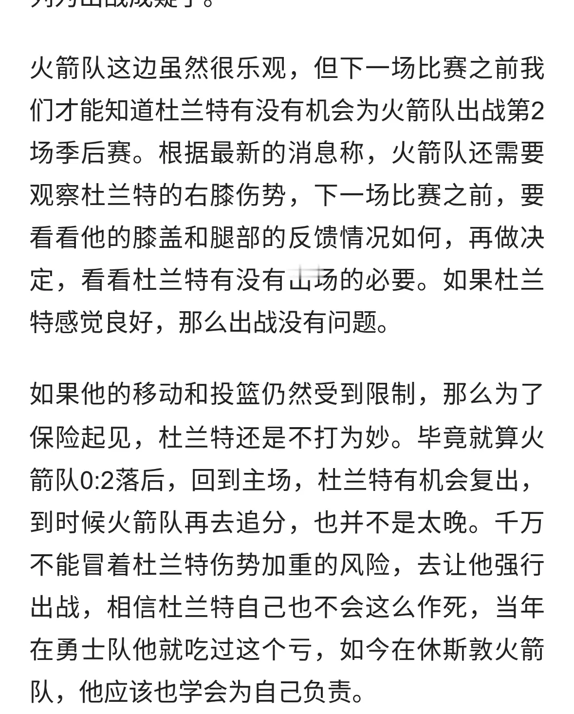 杜兰特复出还有必要吗?假如下一场火箭主场赢,扳成3-3,杜兰特最后一场抢七复出湖