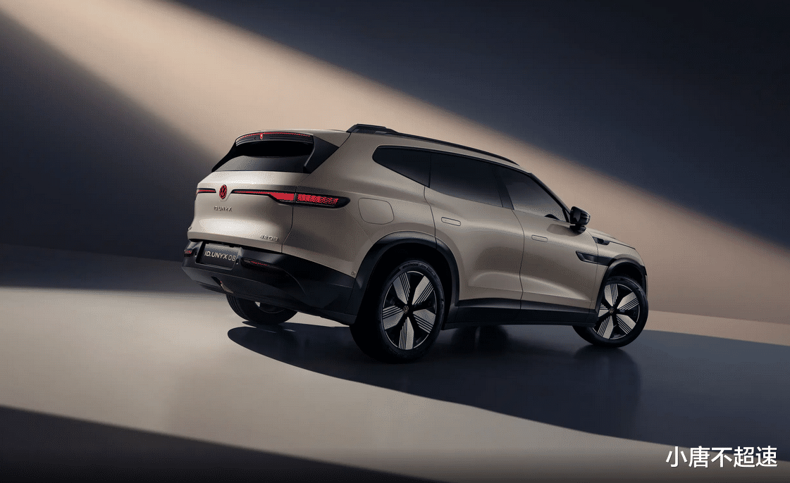 与众08前脸采用封闭式造型,中央为可发光金色大众标识,前包围带有黑化装饰。车身侧面配备无框车门、隐藏式门把手、车顶行李架,A柱黑化处理。尾部采用狭长平直尾灯组,中央为红色发光尾标,下方“ID.UNYX”金色标识,尾门右侧有“与众08”字样,后扰流板集成狼头高位刹车灯。提供八种车身颜色可选。