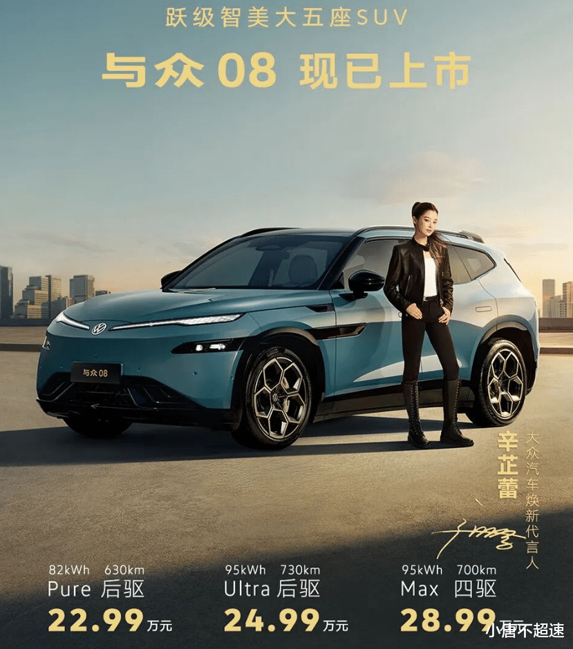 4月16日,大众安徽旗下第二款量产车——与众08正式上市。新车共推出三款纯电动车型。与众08定位中大型纯电SUV,车身长宽高分别为5000毫米、1954毫米、1688毫米(1672毫米),轴距达到3030毫米,采用五座布局。