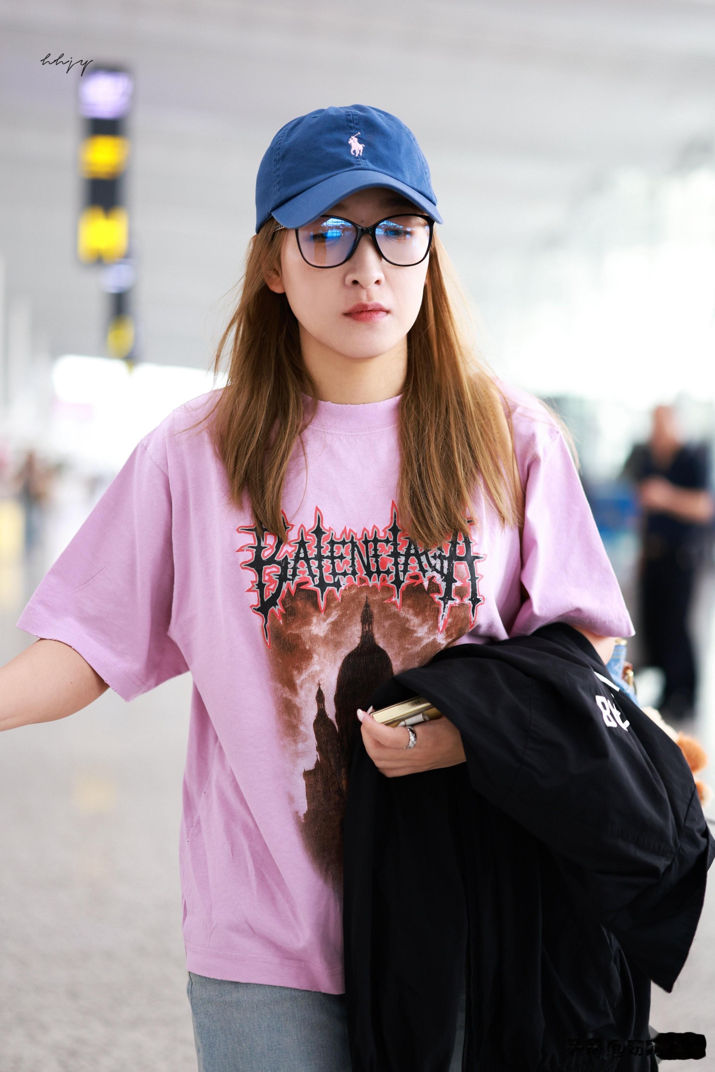 刘诗雯广州机场出发!紫T配蓝鸭舌帽太甜了,不愧是国乒第一颜霸