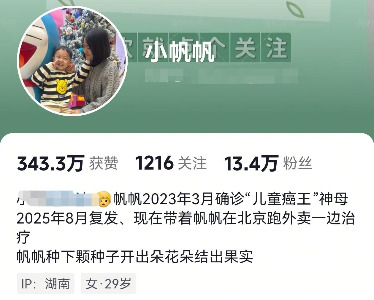 好在第一阶段治疗结束后,病情稳定了一段时间,让人痛心的是,一度好转的病情到了2025年8月份又复发了,于是父母带着孩子长期在大城市治疗,他们也边治疗边送外卖、做直播,只为让孩子获得基本的治疗条件。
