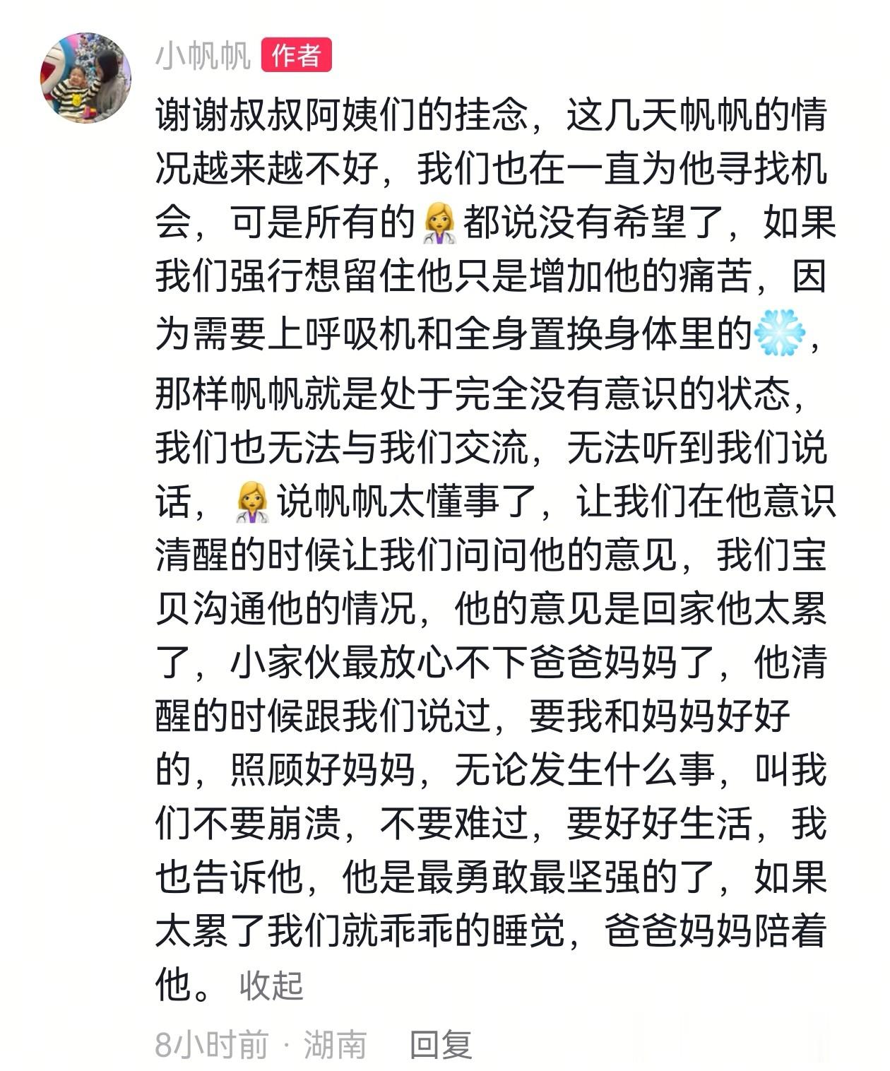 所以医生建议,在孩子清醒的情况下,父母和孩子沟通一下,然后带孩子回家,没想到孩子非常懂事,说自己太累了,想回家,并让爸妈好好生活,不要难过。
