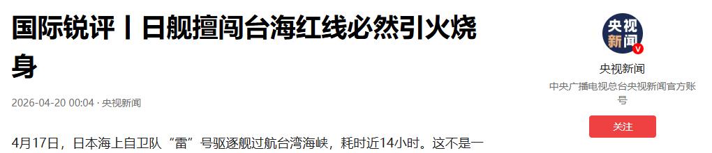 央视新闻:国际锐评丨日舰擅闯台海红线必然引火烧身