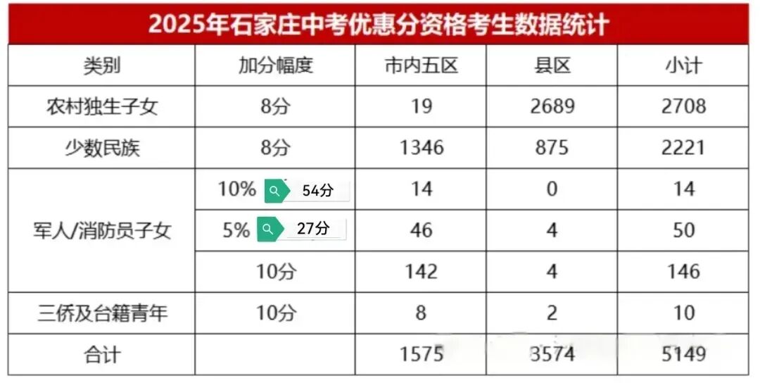 简单介绍一下石家庄中考加分的优惠政策,就是符合一定条件的考生,可以分别获得8分、10分、“普高线”*5%、“普高线”*10%等几档不同分值的加分。以去年为例,石家庄中考人数约13.8万人,有5149人获得了中考加分,占比达到了3.71%,相当于每100人就有将近4人可以“加分上岸”。尤其是最高档,可以加54分(虽然仅十余人),接近“小四门”60分的总分,约等于比别人多考了一门。由于,中考难度降低,高分考生越来越多,一分就可能差一二百人,因此我认为中考加分应该设置一个上限,而不是以普高线的百分比作为标准,才更为合理。当然,这里并不是反对中考加分,更不是忽视加分考生家庭为国家做出的贡献,只是希望加分政策可以更加科学合理,确保公平公正。