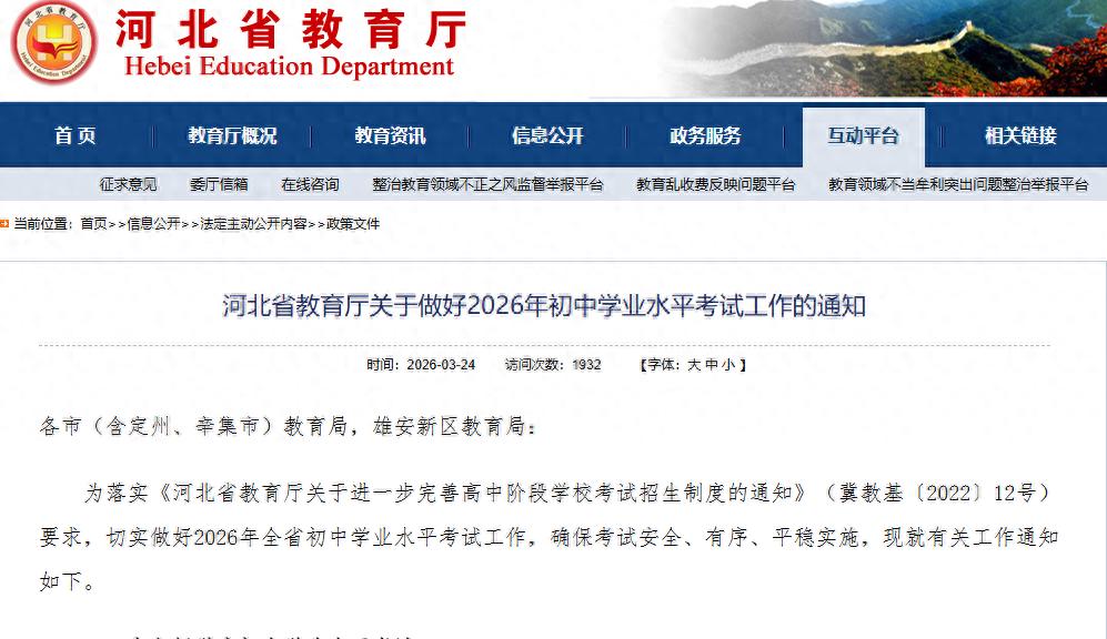 今早中东那边传来了缓和的佳音,也祝愿世界永远不要有战乱侵扰。而在我们身边,另一场没有硝烟的战争——2026年河北中考,已正式进入倒计时!每年这个时候,教育部门都会发布《关于做好2026年初中学业水平考试工作的通知》,明确了6月21日—23日是全省统一中考时间。其实,每年“中考通知”的框架基本稳定:考试分值、形式、体育(5月底前)、成绩公布、考务要求等都大同小异,只是表述和文字上的微调。但今年,两大关键细节值得所有家长关注,或许会影响开卷考试的规则与优惠加分政策!
