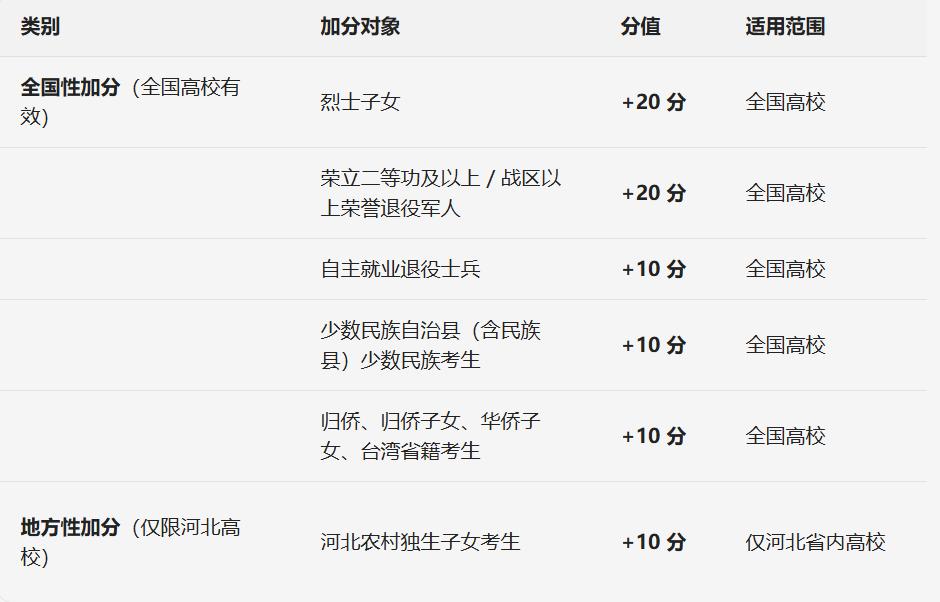 那么中高考加分政策如何衔接一致呢?咱们来看目前高考的加分政策有哪些:第一,烈士子女加20分;第二,荣立二等功以上或被战区以上单位授予荣誉称号的退役军人,加20分;第三,自主就业退役士兵,归侨/华侨子女和台湾省籍考生,加10分;第四,少数民族自治县(含民族县)的少数民族考生,加10分。第五是农村独生子女考生,可以加10分,但仅限报考河北省内高校时使用,且需满足户籍、审核等条件。