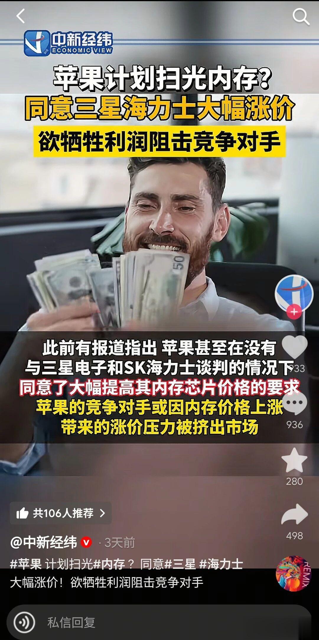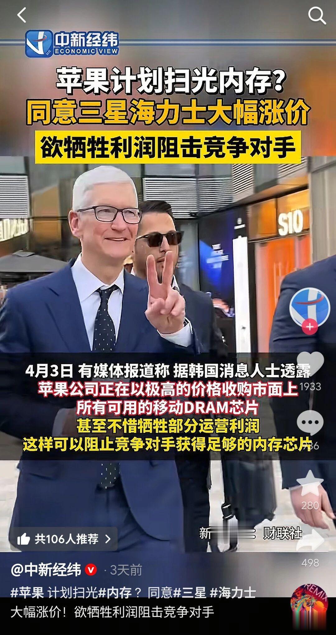 这做法看似疯狂,但结果就是苹果一扫货,那么其他竞争对手短期内就买不到内存,没有内存你连一台完整的手机都组装不出来,直接影响生产规模,这一招釜底抽薪直接打七寸。届时其他手机厂家很可能无机可卖,或者只能花更高的价格去预定下一批存储芯片,这样成本再上升,怎么看苹果这做法都不吃亏。