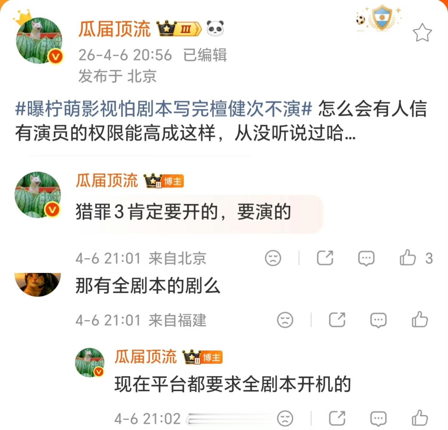 很难评,柠萌这真的不是在本末倒置吗?像猎罪图鉴这样一个IP能火出圈,靠的是好剧本、好角色、好演员互相成就,不是靠先把演员绑死,再随便糊弄个剧本出来割韭菜。