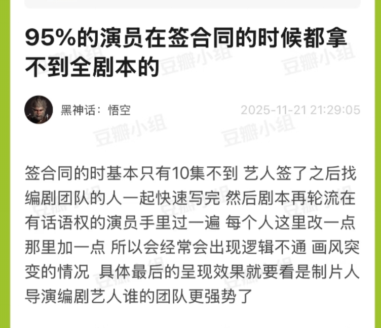 首先这个全剧本这句话就有问题,没有哪个演员在拍前能看到全剧本的!我之前看张译采访说,他每次拍戏也都是拿不到全部的剧本,所以有的剧到后面就很乱!看吧,像张译这种已经很有咖位了,还拿不到全本!