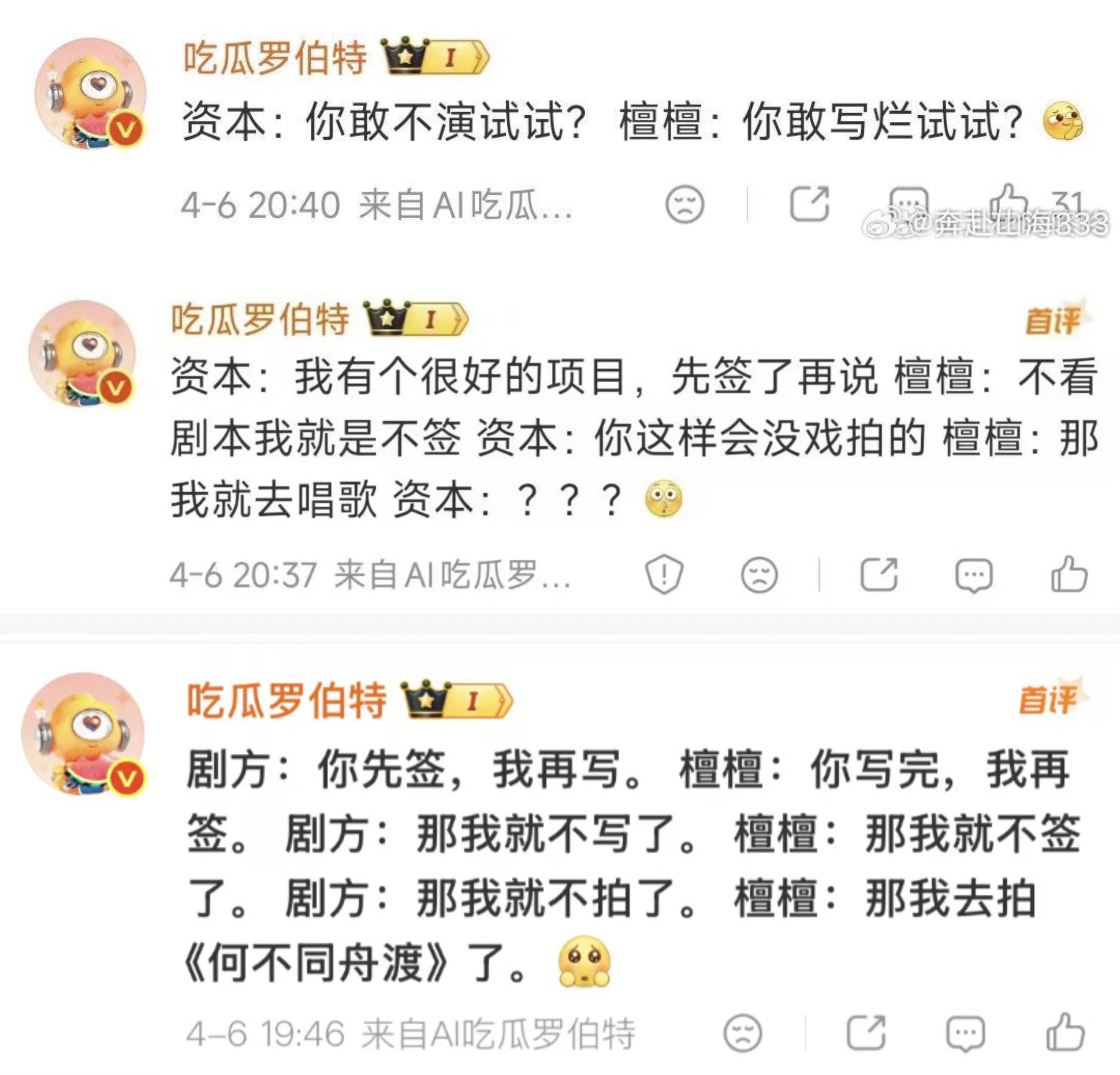 于是开始紧急公关甩锅檀健次,说怕剧组写完剧本檀老师不演!这不是试探了,这是在施压!