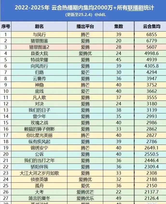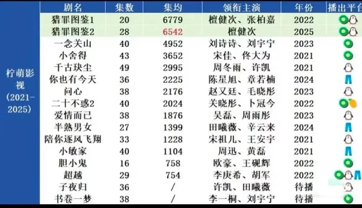 柠檬影视集除了《猎罪图鉴》,均集6000万以上的剧竟然是0部? ​​​翻看柠檬影视2021-2025集均表,檀健次主演的《猎罪图鉴1》为列第一名,《猎罪图鉴2》第二名,猎罪系列集均都在6400万+,小投入大回报! ​