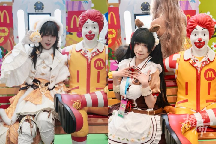 标志性麦当劳叔叔座椅的入驻,也成为全场极具辨识度的合影地标。无论是身着华丽服饰的Coser、妆容精致的Lolita爱好者,还是抱着孩子逛展的家长、前来打卡的普通观众,路过时都会不由自主地驻足,拿起手机拍上几张。胆大的观众,更是会主动坐到麦当劳叔叔身边合影留念。