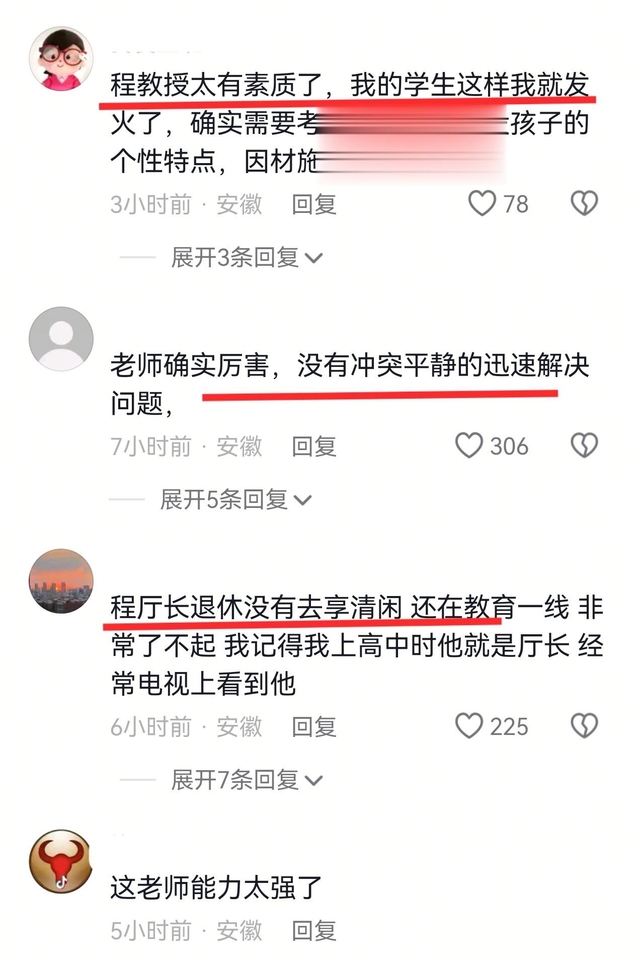 程艺教授的机智应对赢得了众多网友的赞美,在那种情况下,程艺教授全程都保持了稳定的情绪,非常平静地化解了问题,没有耽误太多时间,也“拯救”了那位男生。
