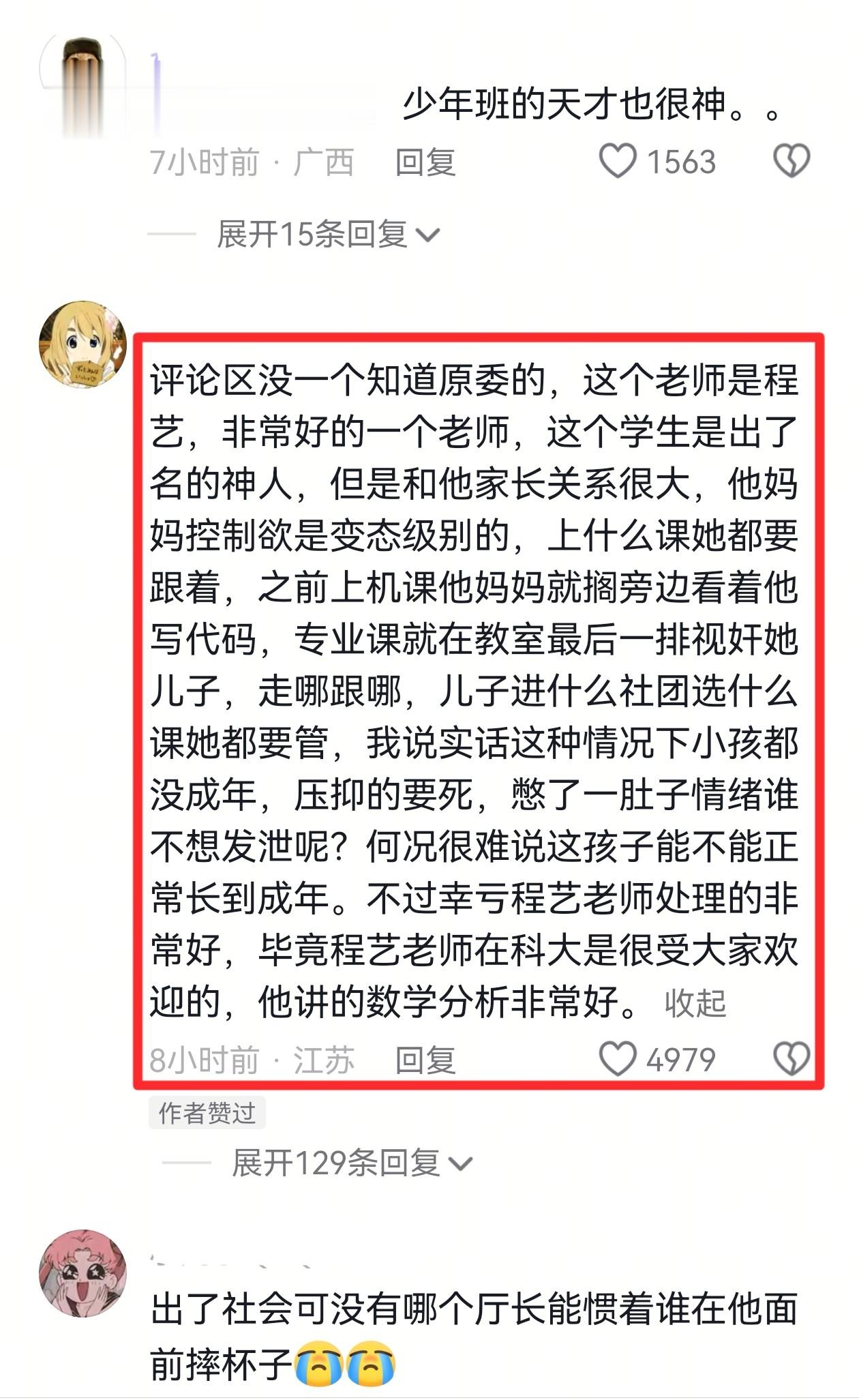 首先要说明,这件事和程艺教授本人以及上课没有任何关系,仅仅是该男生和家庭的原因,据多位知情人透露,课后程艺教授还和该男生家长谈话了,并提醒家长,如果不改善教育方式会害了孩子。