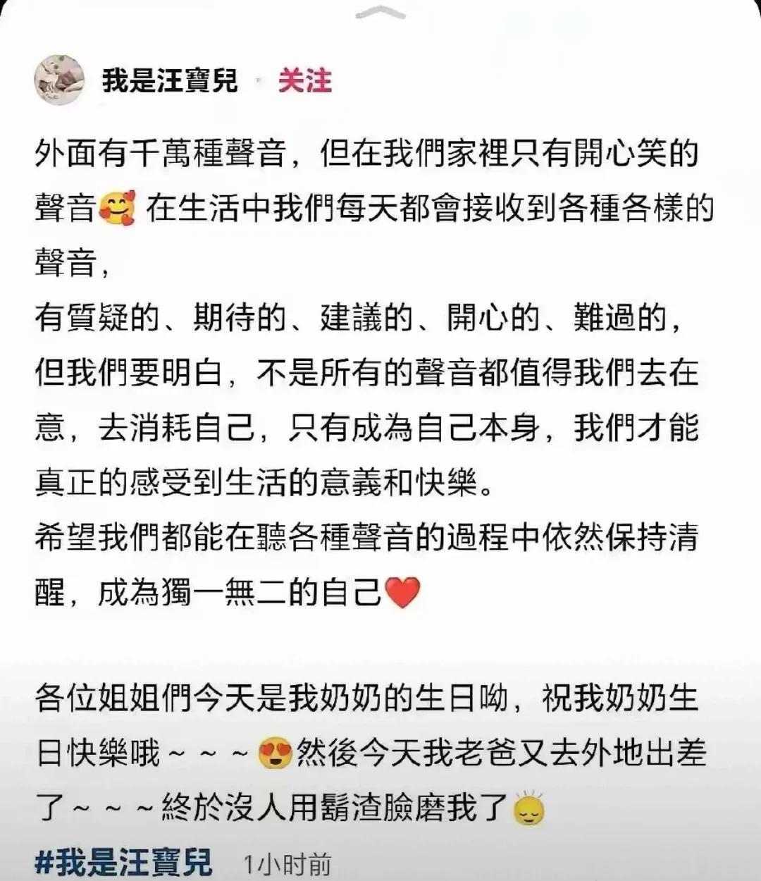 曾经经常到直播间给婆婆刷礼物的马筱梅,这次换了一种方式——用儿子的新号发了一篇长篇文案。表面上是祝福,实际内容更多是“自己要清醒做自己”,顺带替汪小菲解释出差的事。网友们纷纷吐槽:“文案里喊网友祝福奶奶,祝福的内容却一字不提,连小玥儿姐弟俩都没顺带说句祝奶奶生日快乐,这是在打擦边球吗?”还有网友调侃:“兰姐一个人在北京扛黑粉,儿媳妇在台湾晒儿子的脸,画风完全对不上。”