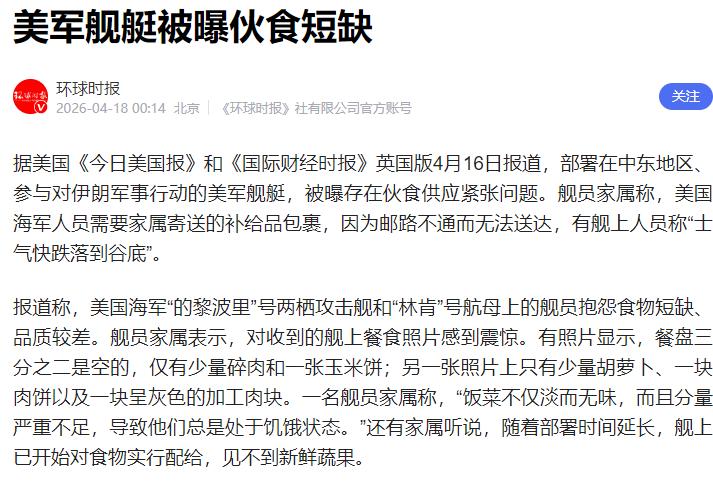 2026年4月,美国海军一个月内两艘核动力航母相继起火,主力舰艇伙食标准跌破底线。