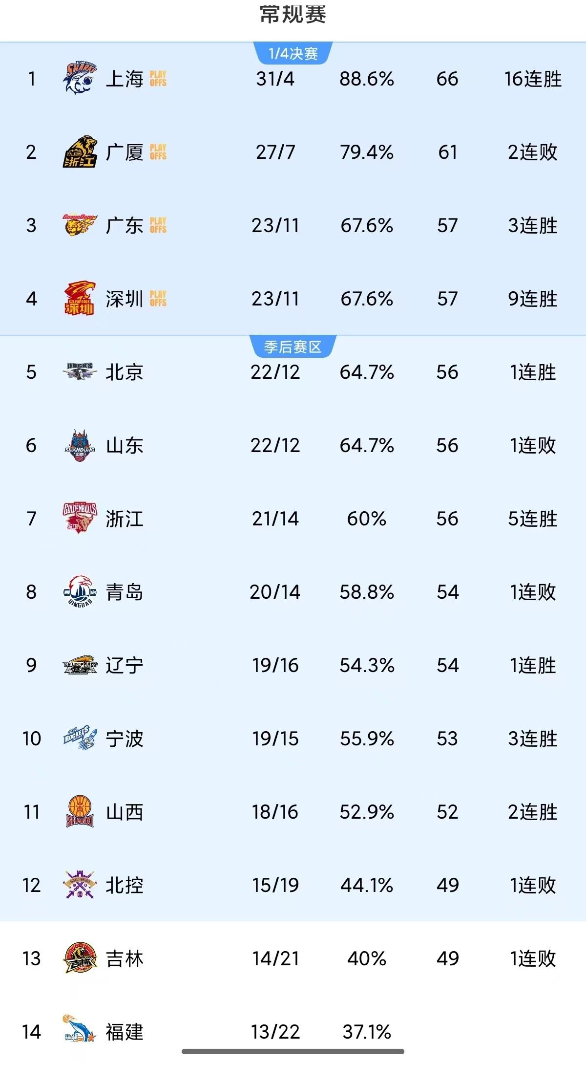 随着本轮比赛结束,上海队目前31胜4负排名第一,并且已经拉开跟第二名广厦的胜场差距,按照上海队的态势,以及后续赛程,本赛季的常规赛冠军基本锁定,这赛季的上海男篮确实强势啊。