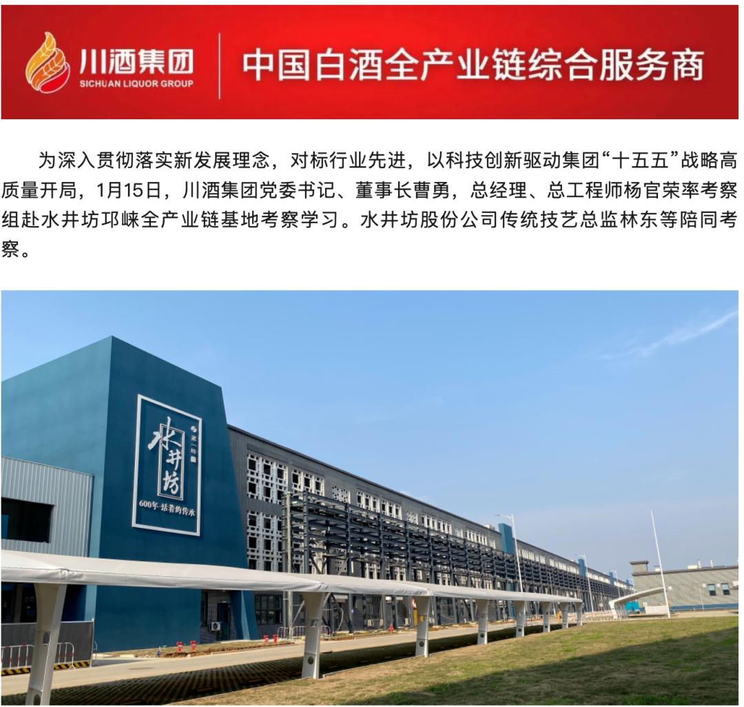 最直接的线索,就是1月15日的一次考察。川酒集团党委书记、董事长曹勇,总经理、总工程师杨官荣,带队去了水井坊邛崃全产业链基地考察学习。水井坊这边,传统技艺总监林东等人陪同。