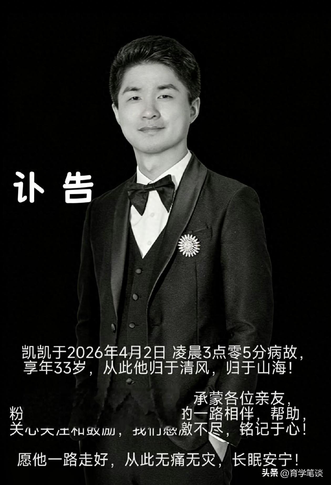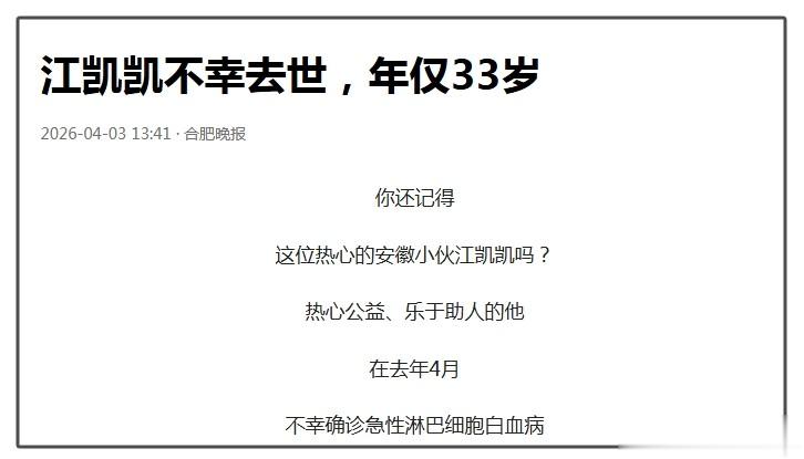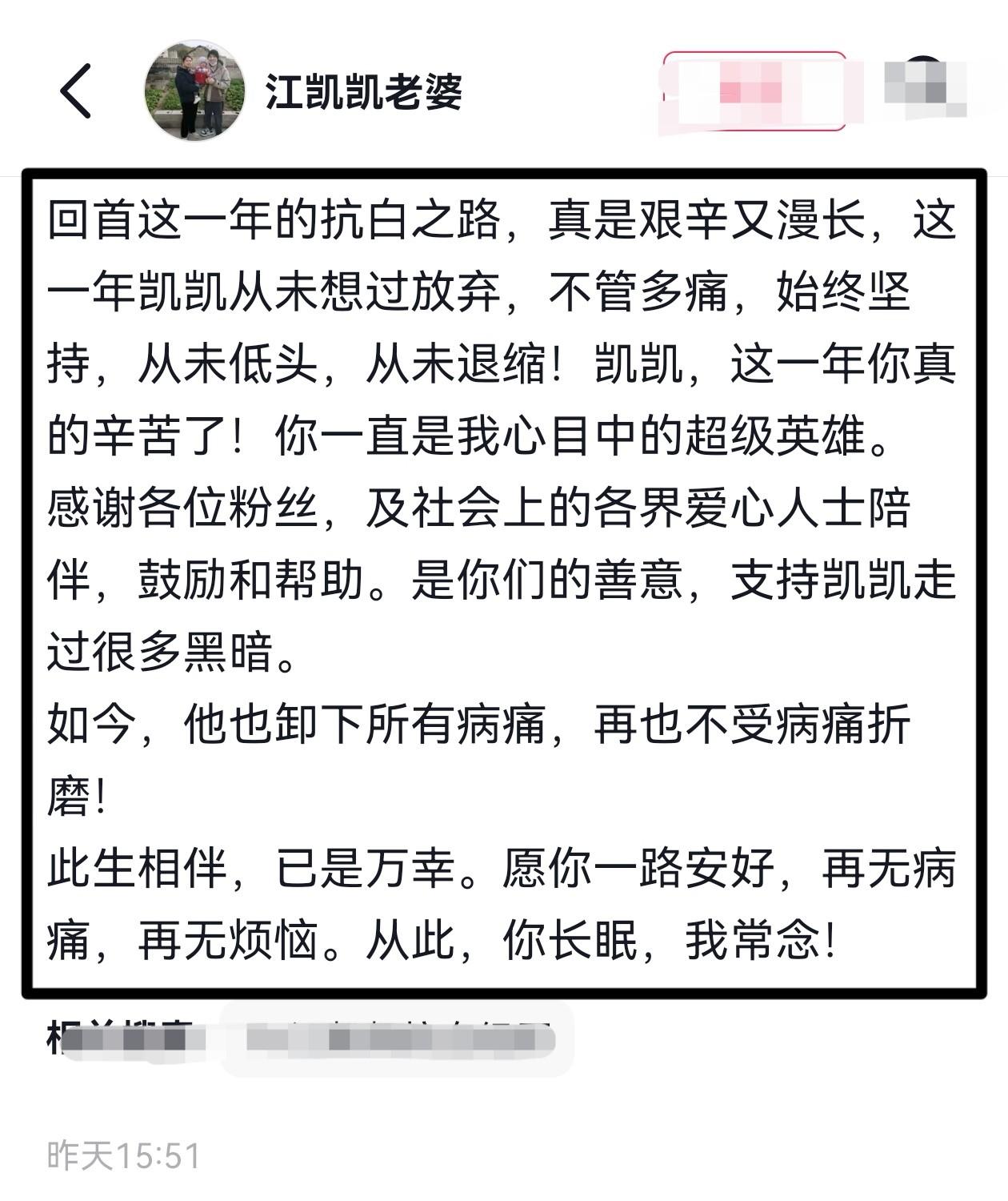 江凯凯的妻子在讣告中透露,丈夫已于4月2日凌晨去世,年仅33岁,并感谢大家一直以来对江凯凯的帮助和照顾,尽管丈夫非常努力,大家也都积极支持,可终究还是没能留住丈夫。