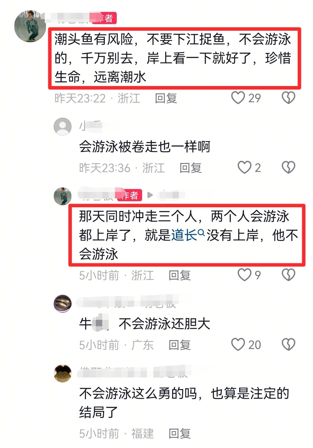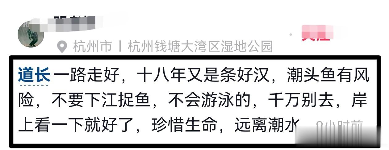 3月31日深夜,也曾参与抢潮头鱼的博主在社交媒体发文悼念“道长”,称“道长”已经去世,并提醒所有人,抢潮头鱼有风险,不要下江捉鱼,尤其是不会游泳的朋友,千万不要下水,珍惜生命,远离潮水。