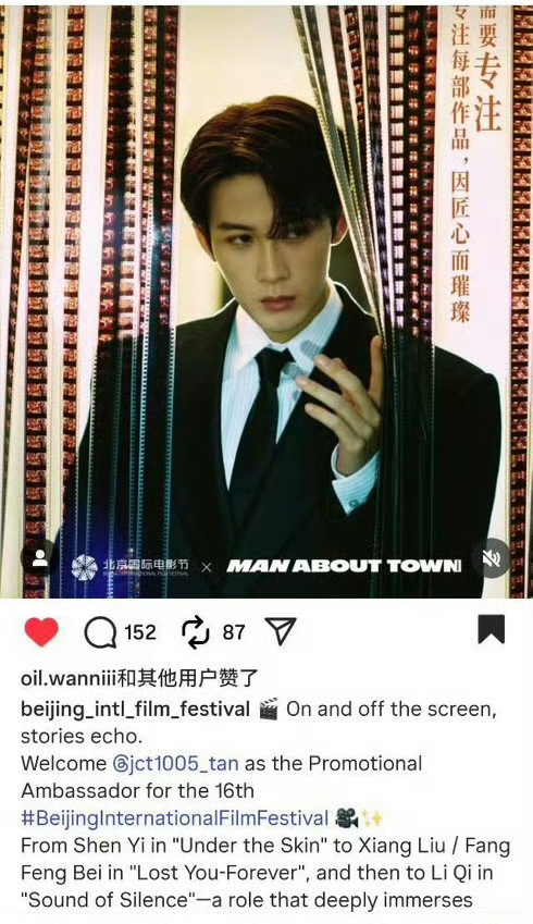 檀健次是根正苗红的青年电影人,正如北京国际电影节所言,他能体会镜头前的千钧重量,也珍视银幕下的万千热爱,既能以表演叩击人心,亦能以热忱传递光影力量。