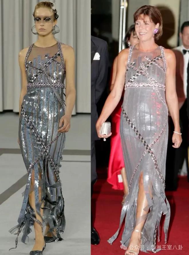 大姑子卡洛琳早年的香奈儿高定,若干年后借次媳碧翠丝穿过,谁穿谁像孕妇