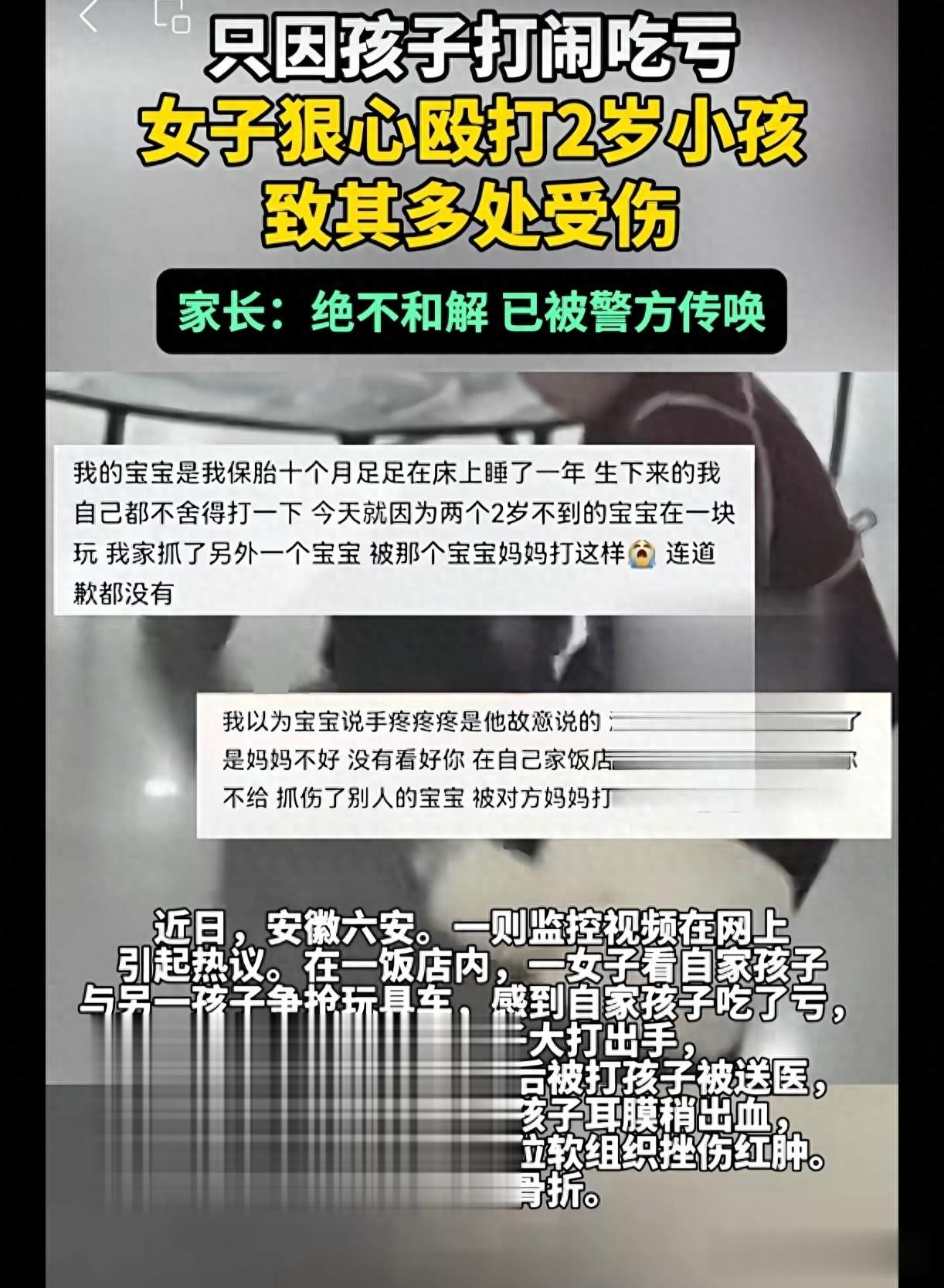 “一个才两岁的孩子,骨头都还没长硬,你怎么忍心啊!”近日,安徽六安一家饭店发生一起小孩纠纷事件,该饭店2岁的女儿被另一名孩子妈妈D a至右手手指骨折,看着都让人心疼,更让人意想不到的是D a人女子身份引人热议!