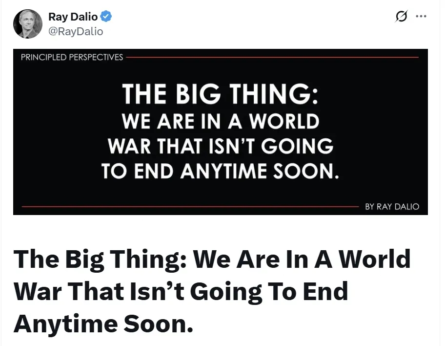 达利欧的判断很直白:这不是一场局部冲突,而是一场"世界大战的组成部分",而且不会很快结束。