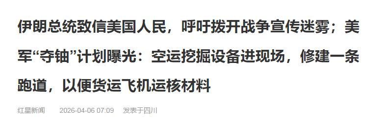 伊朗总统致信美国人民,呼吁拨开战争宣传迷雾;美军“夺铀”计划曝光:空运挖掘设备进现场,修建一条跑道,以便货运飞机运核材料红星新闻 2026-04-06 07:09