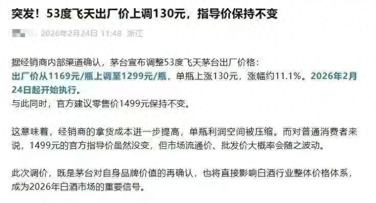 所谓的“经销商内部渠道确认”,本身就是无法核实的模糊信源。茅台最近一次调整飞天出厂价是2023年11月1日,从969元上调至1169元,那一次是有官方公告的。两年多没动过,突然要在2月下旬这个淡季节点涨价,还只靠一张截图传播,可能性不大。