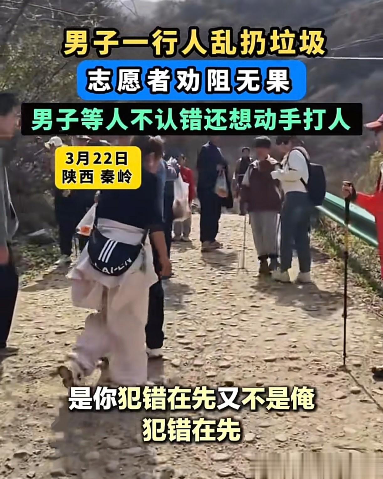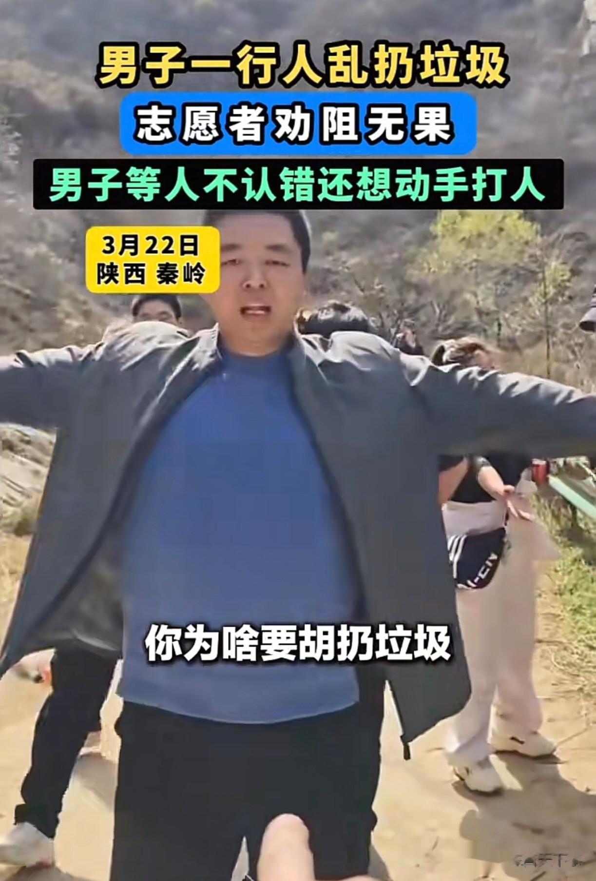 “乱扔垃圾还有理了!”3月22日,一群志愿者在陕西秦岭做公益捡垃圾,每个队员身上都背了不少垃圾下山,却在路上遭遇一眼镜男和几个同伙在山里乱扔垃圾,本着“爱护环境,人人有责”的理念,志愿者团队中的一名姓白的男子上前劝阻,眼镜男等人不仅不认错,还想动手打人。