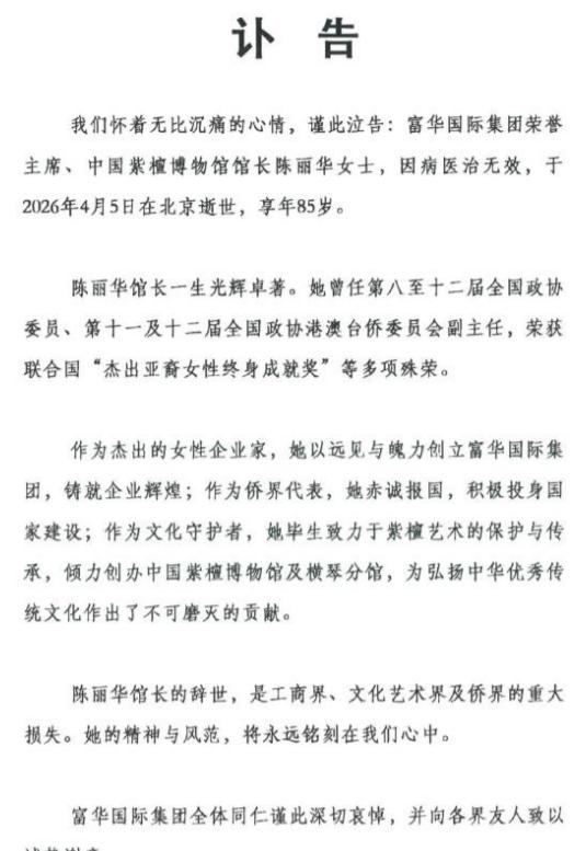 传来噩耗4月7日,富华国际集团发出讣告,陈丽华女士于4月5日在北京离世,享年85岁,消息瞬间引爆热搜。