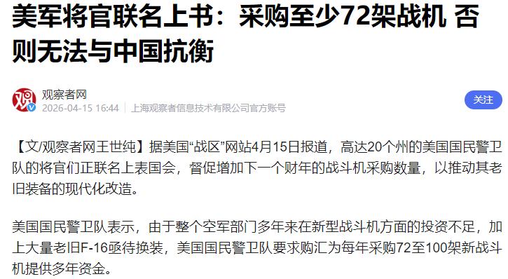 美军又开始“卖惨要经费”,据美媒报道,多达二十个州的美国国民警卫队将官联名上书国会,要求每年采购72至100架新战斗机,其给出的理由是中国的歼-35战机和“协同作战飞机”正在开足马力建造,按照这个势头发展下去,美军在亚太地区将失去“优势”,无法与中国“抗衡”。