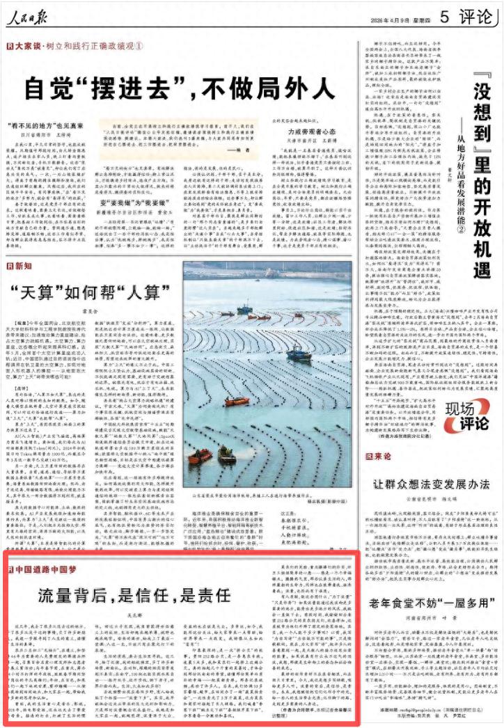 4 月 9 日,台湾歌手吴克群在《人民日报》评论版发表署名文章《流量背后,是信任,是责任》。