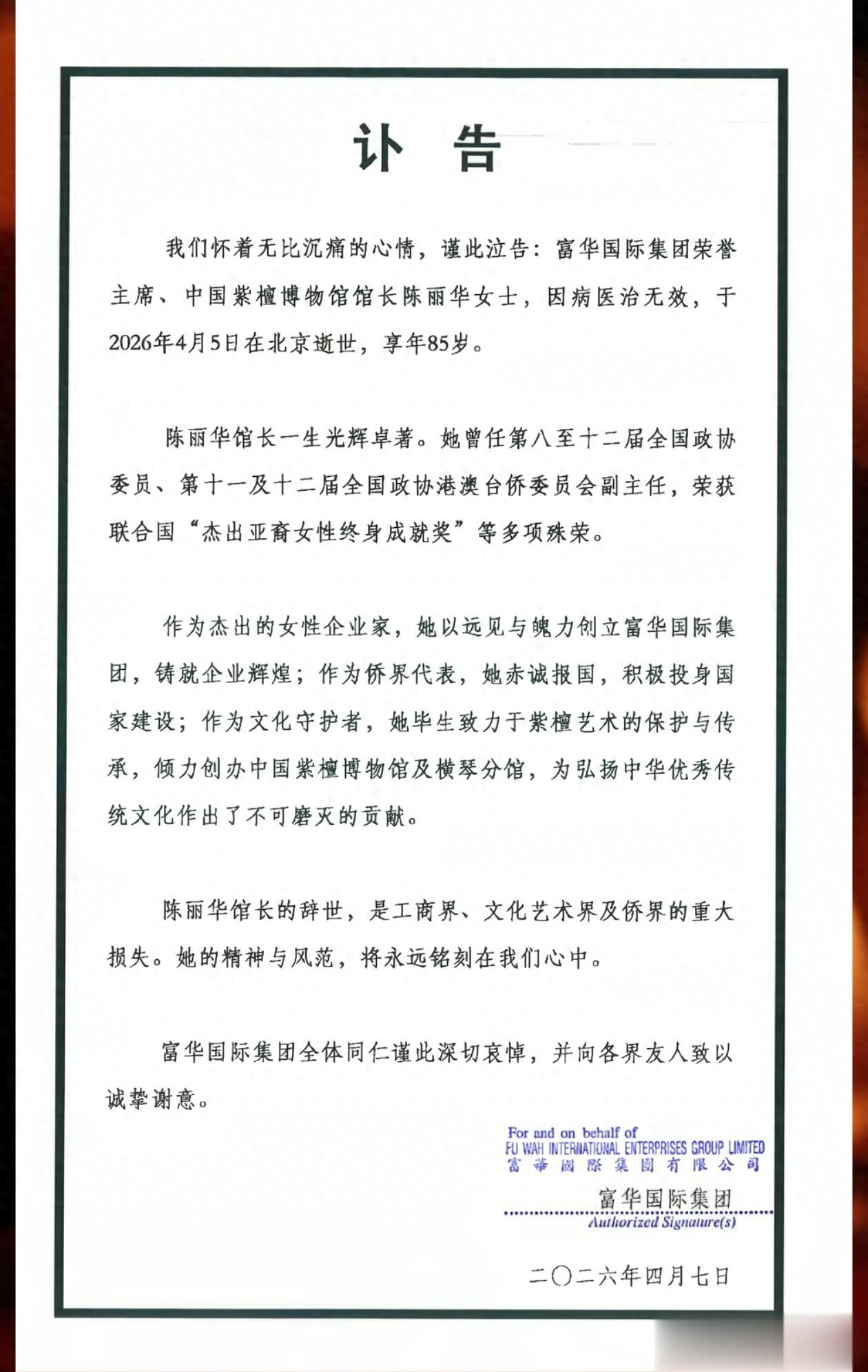 4月7日,富华国际集团发布了一份讣告,称该集团荣誉主席、中国紫檀博物馆馆长陈丽华女士于4月5日在北京因病医治无效逝世,享年85岁。