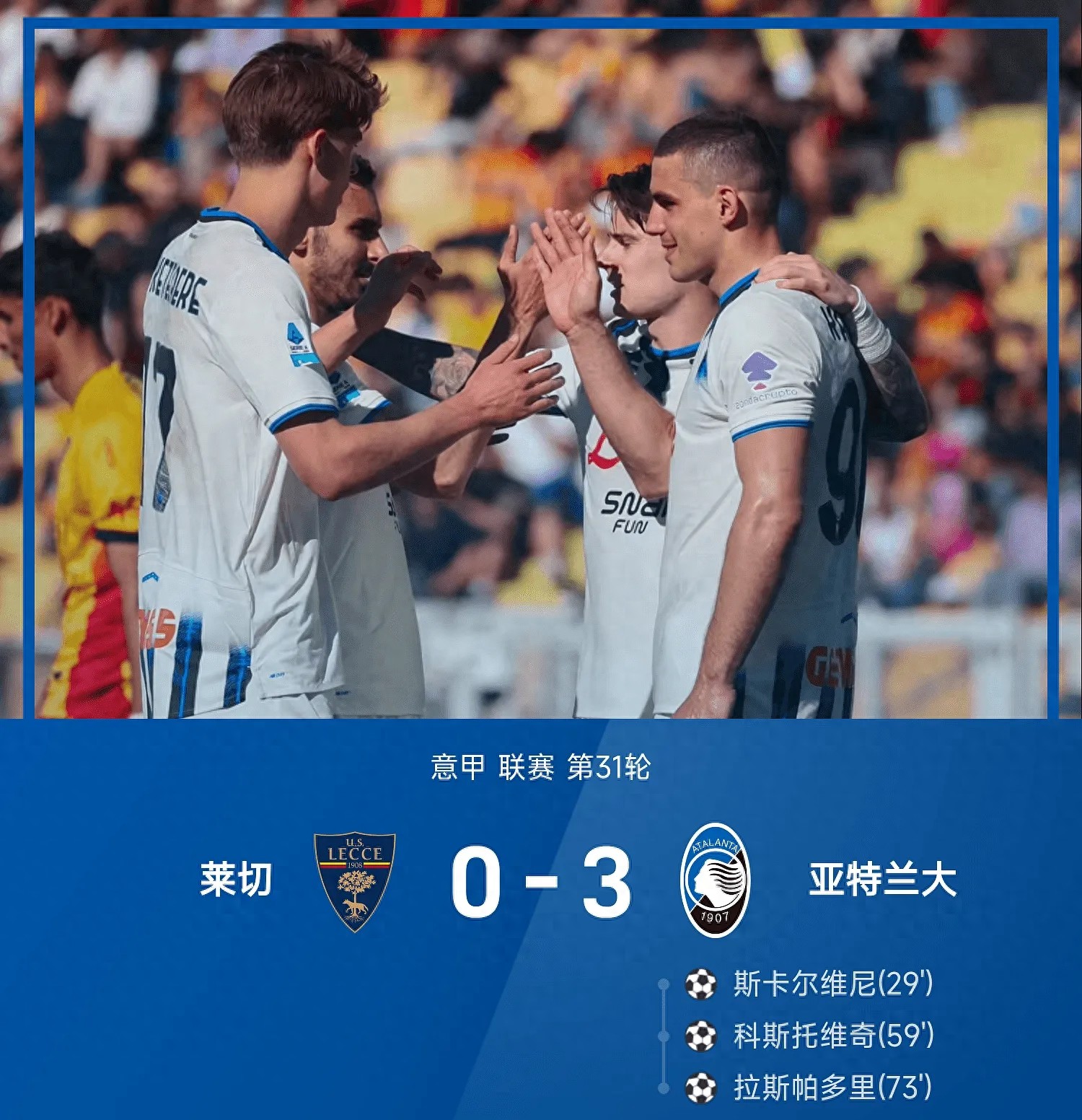 4月6日25/26赛季意甲联赛第31轮,亚特兰大客场以3-0大胜莱切,斯卡尔维尼、科斯托维奇和拉斯帕多里联袂建功,帮助亚特兰大取得大捷。亚特兰大拿到关键三分后,继续向着欧战区发起冲击。