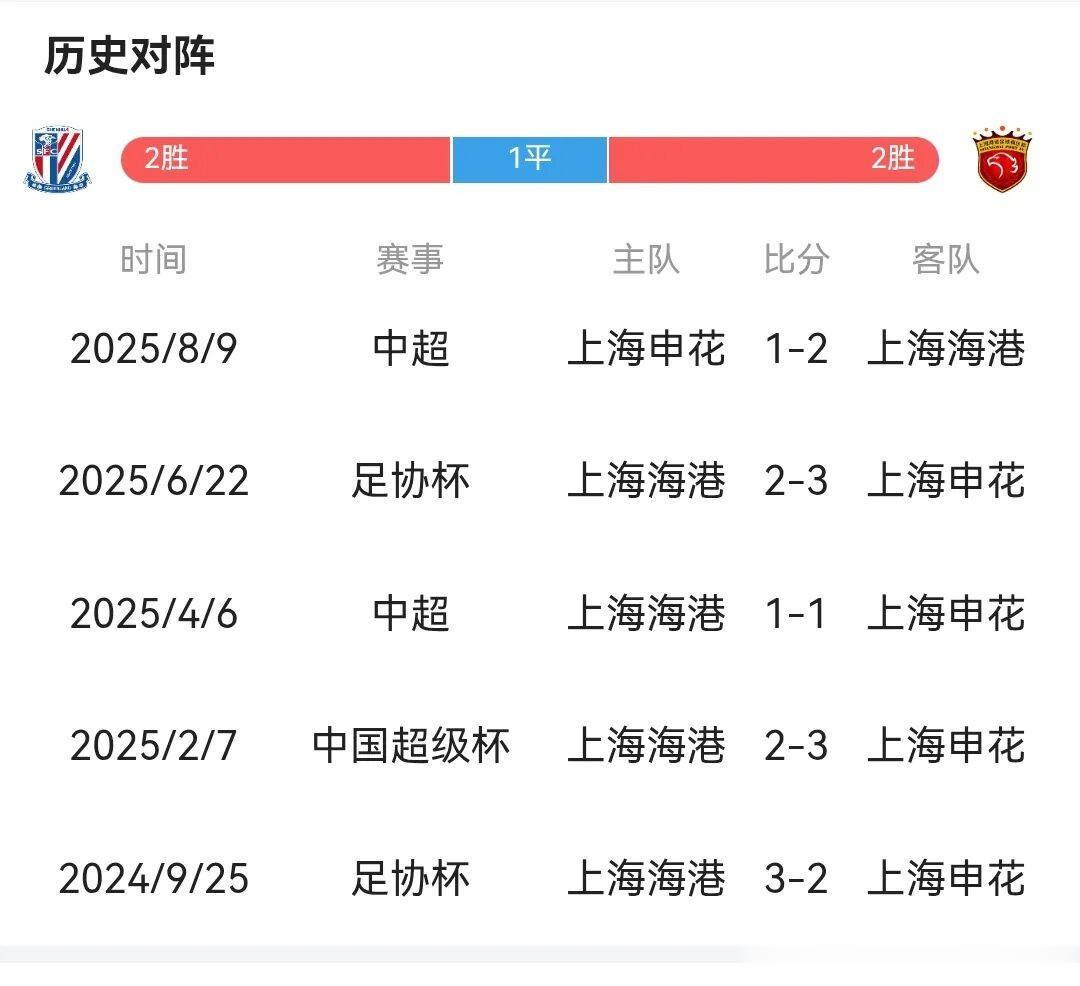 值得一提的是,两队之间最近的五场交锋分别两胜一平两负,其中包括两场足协杯的比赛,分别是三比二战胜对手,超级杯申花三比二客场赢了海港,联赛当中的最近两场则是海港从申花身上拿了4分!