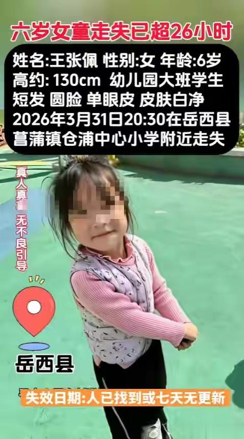 6岁的王张佩,身高110厘米,短发,圆脸,单眼皮,皮肤白净。失踪时上身穿印有动物图案的针织衫,下身是带卡通图案的牛仔裤。性格乖巧,从不乱跑。