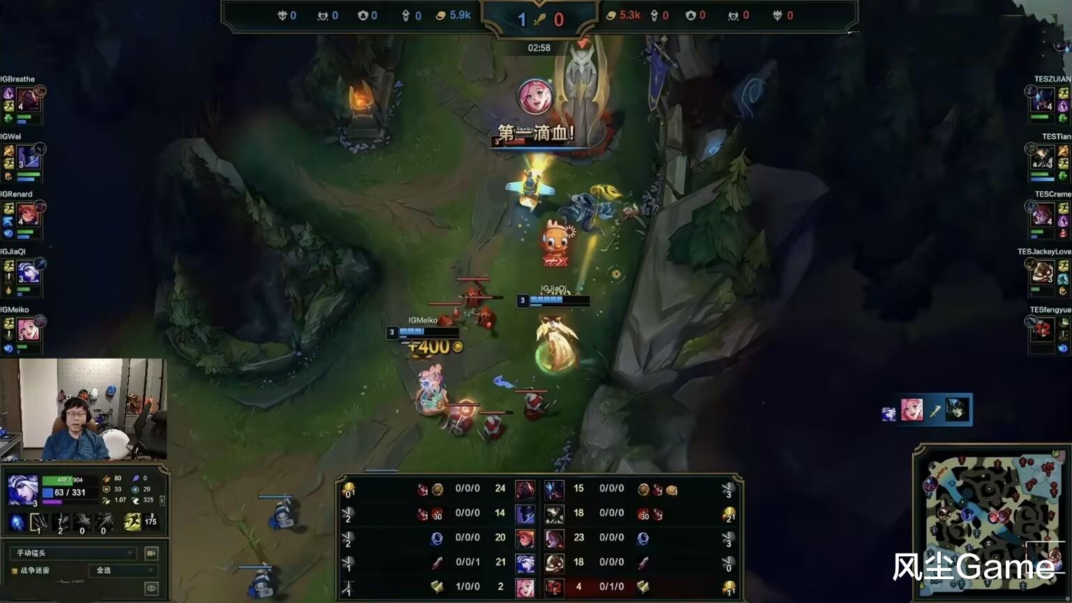 很多小伙伴,估计都没看比赛,咱们简单回顾一下这场BO3,第一把IG直接亮剑,上路锁下薇恩,Meiko也掏出了,他不太擅长的巴德,滔搏的阵容就比较常规,开局2分钟,Wei一波抓下,成功击杀哥哥,刚回到线上没多久,风月又被线杀了,但小天及时赶到,收掉了IG双人的人头。