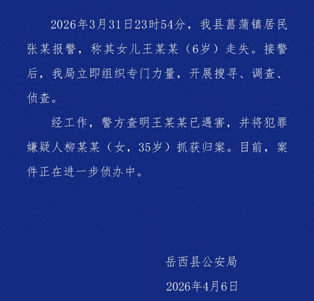 警方4月6日深夜通报,犯罪嫌疑人是一名35岁的女子柳某某,已抓获归案,目前案件还在进一步侦办中。