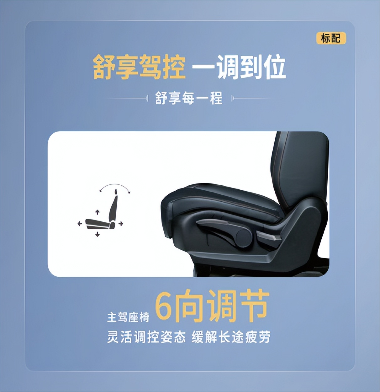 舒适与智能配置的同步升级,进一步提升了日常运营的幸福感。主驾座椅支持6向调节,可灵活调整驾驶姿态,有效缓解长时间驾驶带来的腰部与背部疲劳,让每一趟运输都更轻松。