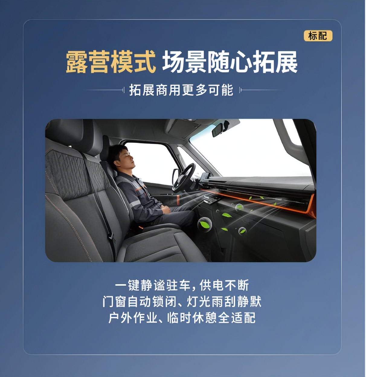 在安全之上,行动派本次升级更聚焦实用场景的体验优化,让用车更便捷、更高效。新增的露营模式堪称城配用户的“移动休息室”,一键开启即可实现静谧驻车、持续供电,门窗自动锁闭、灯光雨刮静默运行,无论是户外装卸货间隙临时休憩,还是中途补能时休整,都能拥有舒适私密的空间,大幅缓解高强度运营的疲惫。同时,V2L外放电功能全系标配,让车辆化身移动电站,户外作业工具供电、摆摊经营用电、应急补能等需求都能轻松满足,拓展了车辆的商用边界,让一车多用成为现实。
