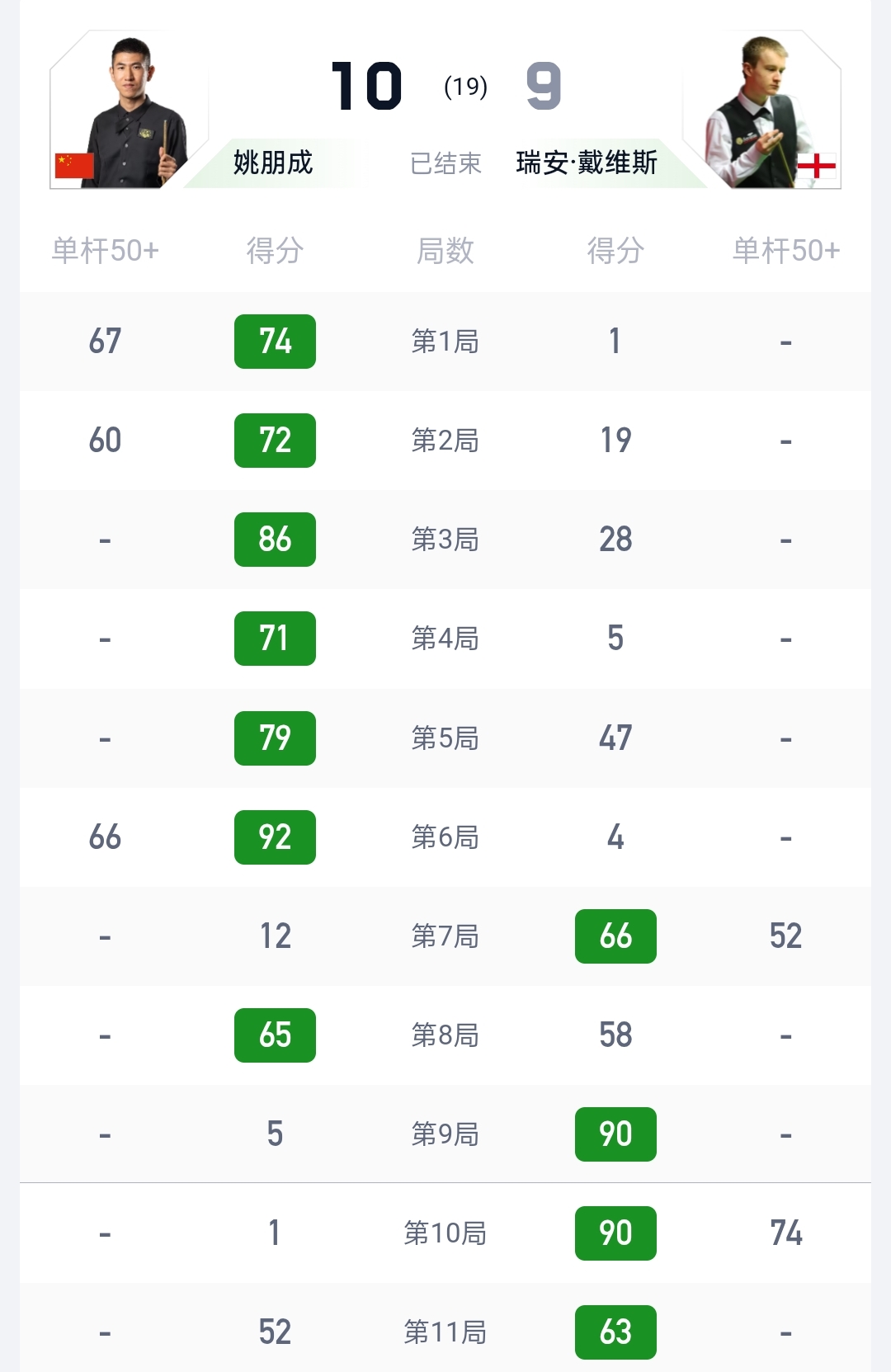 第二阶段比赛,第10局,瑞安戴维斯上来打出单杆74总分90扳回一局,第11局,姚朋成率先进攻打出单杆52,瑞安戴维斯打出总分63完成了逆转再下一局,第12局,姚朋成打出总分64分拿下,第13局,姚朋成率先进攻打出单杆50,瑞安戴维斯打出总分83完成了逆转,第14局,瑞安戴维斯打出单杆59总分73分拿下,第15局,瑞安戴维斯打出单杆76总分130再下一局,第16局,瑞安戴维斯打出总分57-30扳平比分,第17局,姚朋成打出单杆55总分65率先拿到赛点,第18局 ,瑞安戴维斯打出总分71再次追平9-9,双赛点出现,第19局姚朋成打出总分60拿下,总比分10-9绝杀瑞安戴维斯晋级第二轮资格赛!