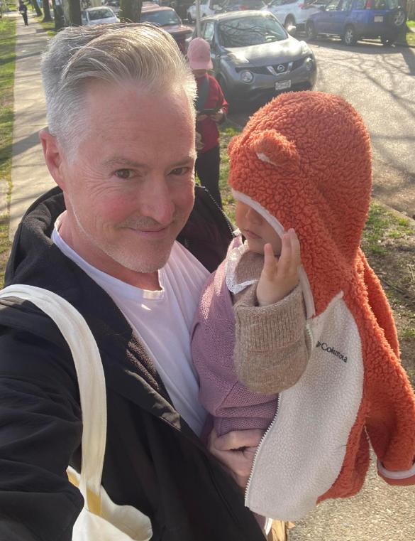 只见他穿着黑色外套与白色打底衫,一身黑白配单手抱娃,另一只手自拍;由于他之前在国内上综艺太火,很多网友都认出了他,纷纷留言。