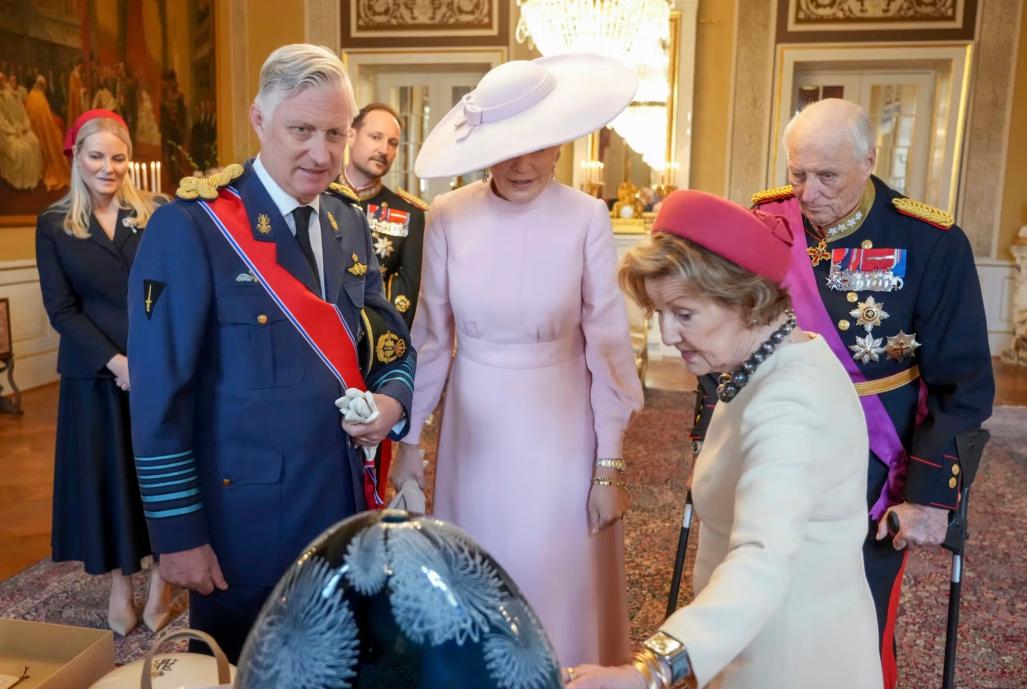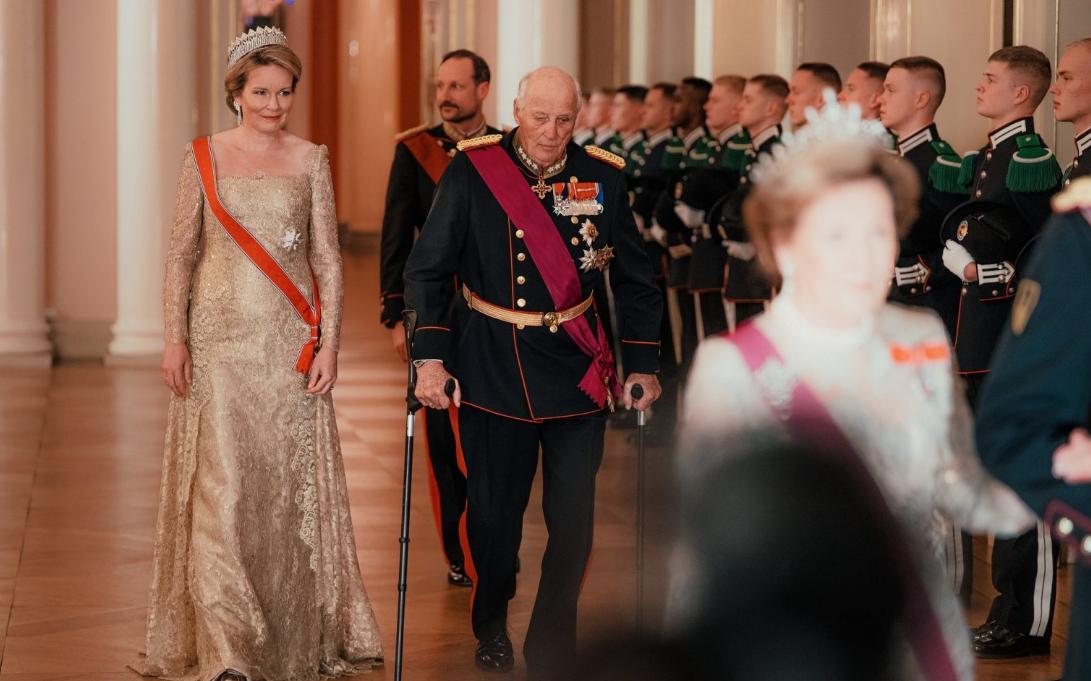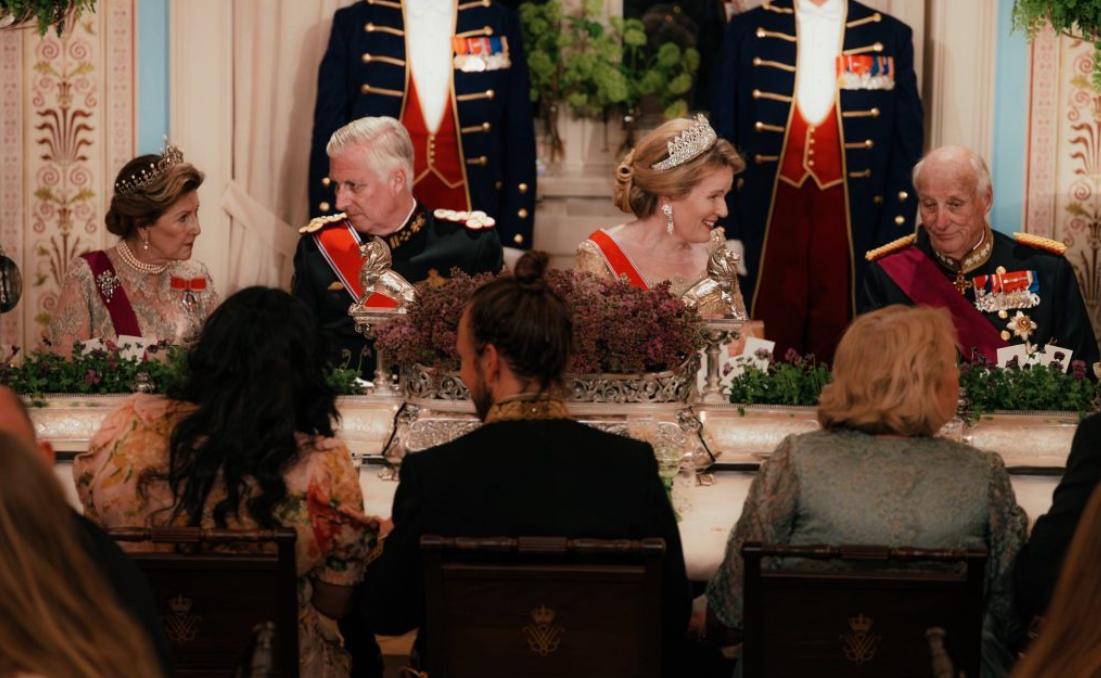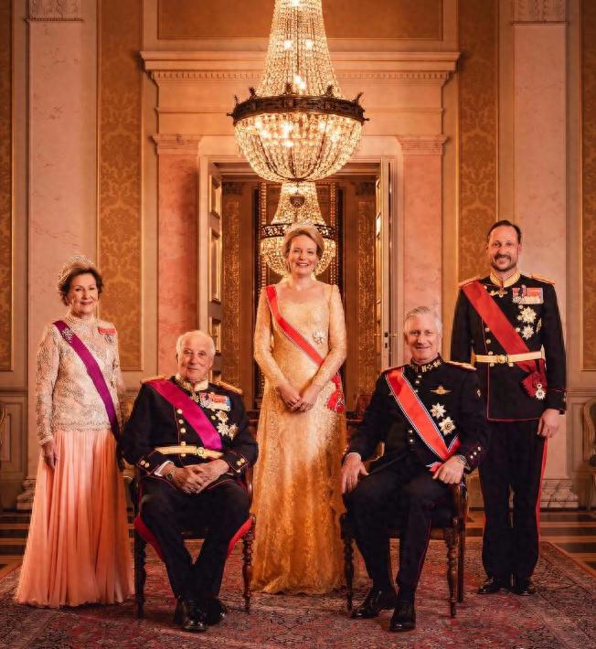 从王室官方晒出的图来看,当天的晚宴很隆重,挪威王后挽着比利时国王的胳膊走在前面,比利时王后与挪威国王并排走在一起,然而哈康王储却是一个人走在挪威国王身后,妻子梅特并没有亮相欢迎比利时国王夫妇的宴会。