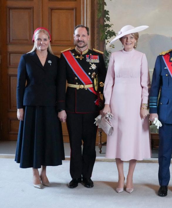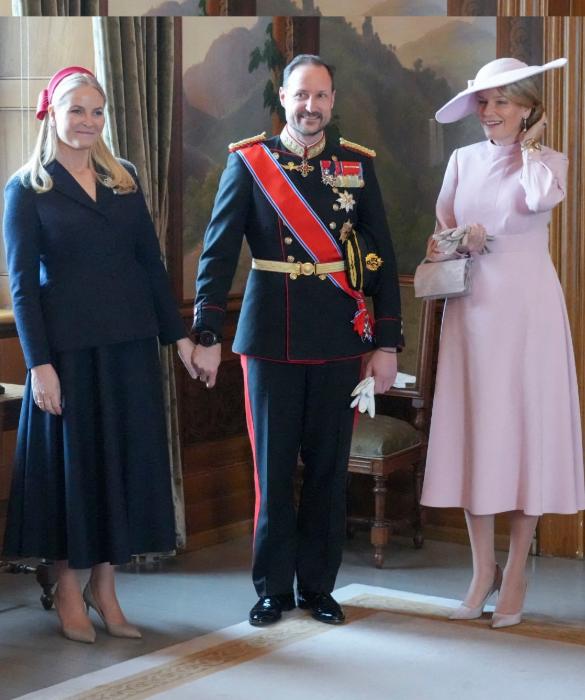 反观比利时王后穿一身粉嫩的连衣裙,头戴粉色礼帽,就连手包与鞋子也是粉色系,全粉造型与梅特之间只隔着挪威王储美翻。